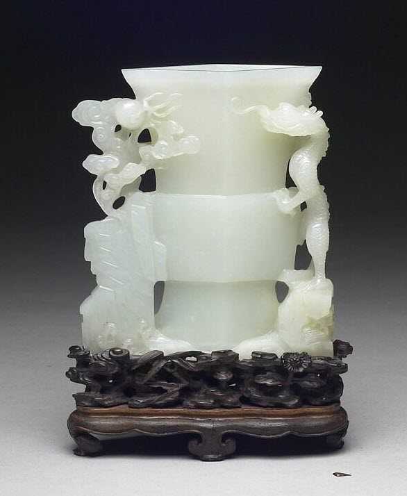 鑒賞鑒定:玉質(zhì)。器形系仿「古銅尊」而來,侈口,口作菱形。器一側(cè)浮琢一龍立于石上,一側(cè)浮琢山石,石上有靈芝與祥云拱珠,器下則琢海浪為底,整體呈現(xiàn)龍搶火珠的場景。器身光素?zé)o紋。附木座。