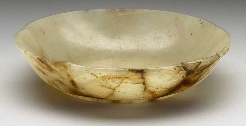 鑒賞鑒定:青玉,玉色泛黃,有大片赭斑,器身有多處裂璺。五圓瓣葵花式口,稍外撇,弧形壁,有圈足。器底圈足內(nèi)有四字隸書款:「嘉慶年製」。